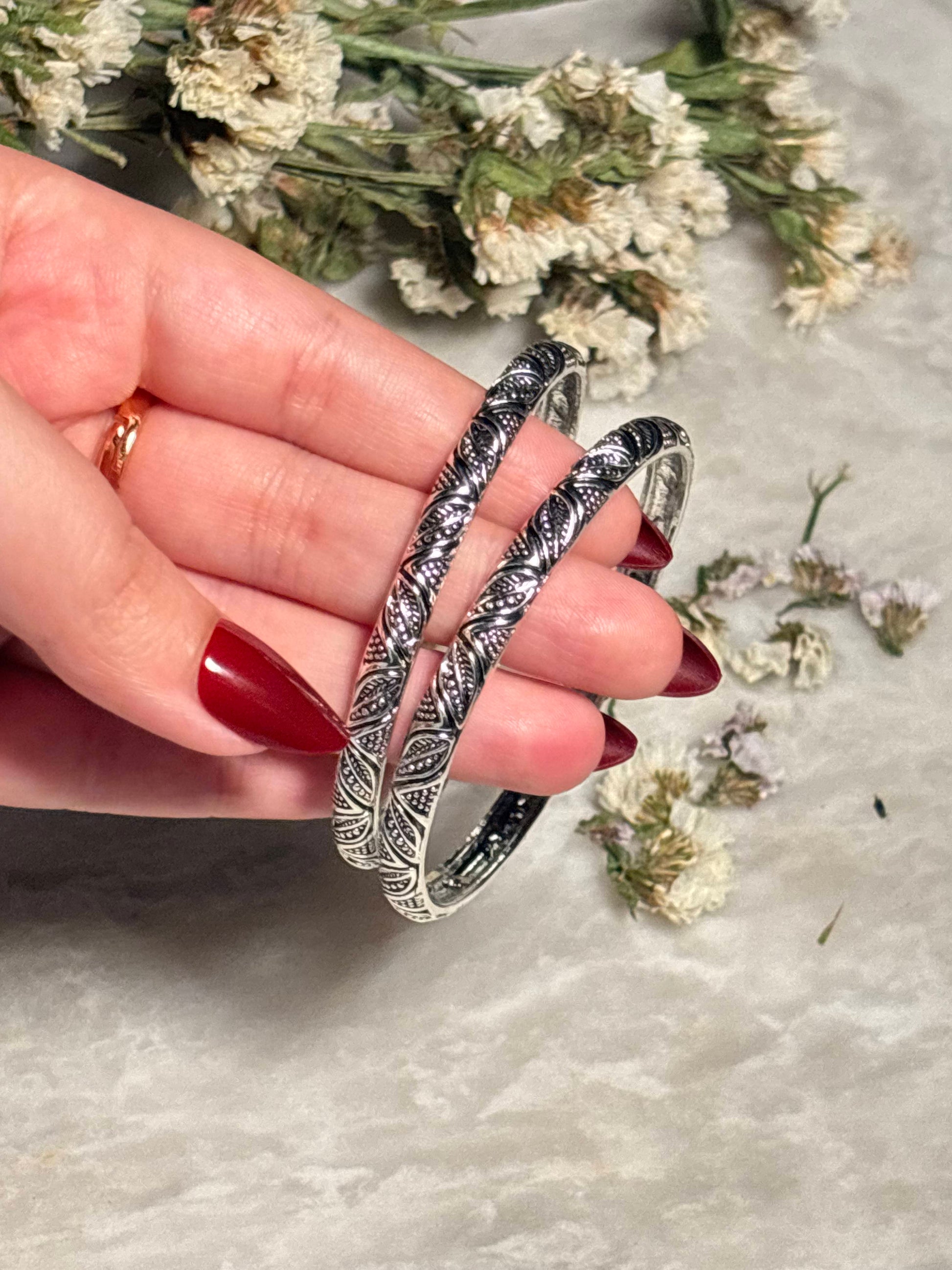 Add a touch of timeless elegance with our Antique Silver Pattern Bangles, beautifully detailed with intricate engraved designs. Crafted with a classic oxidized finish, these bangles bring a vintage charm to any outfit — perfect for both casual and traditional looks.