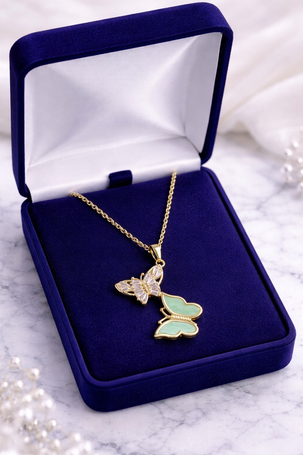 Capture the essence of transformation and grace with our Enchanted Flight Duo Butterfly Necklace. This whimsical piece features two interlocking butterflies in flight: one shimmering with precision-cut baguette crystals and the other inlaid with a serene, matte sage green stone. Set against a polished gold-tone finish, this necklace is a perfect symbol of friendship, growth, or a simple love for the natural world.