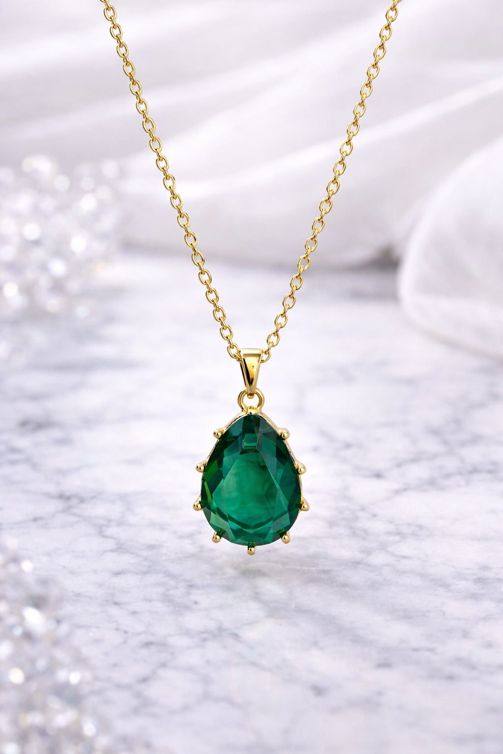 Make an unforgettable impression with the Esme Teardrop Pendant. This regal piece showcases a magnificent pear-cut emerald-toned crystal, faceted for deep brilliance and saturated color. The stone is held by a multi-prong gold-tone basket that adds a hint of crown-like detail to the edges, creating a look of pure opulence.