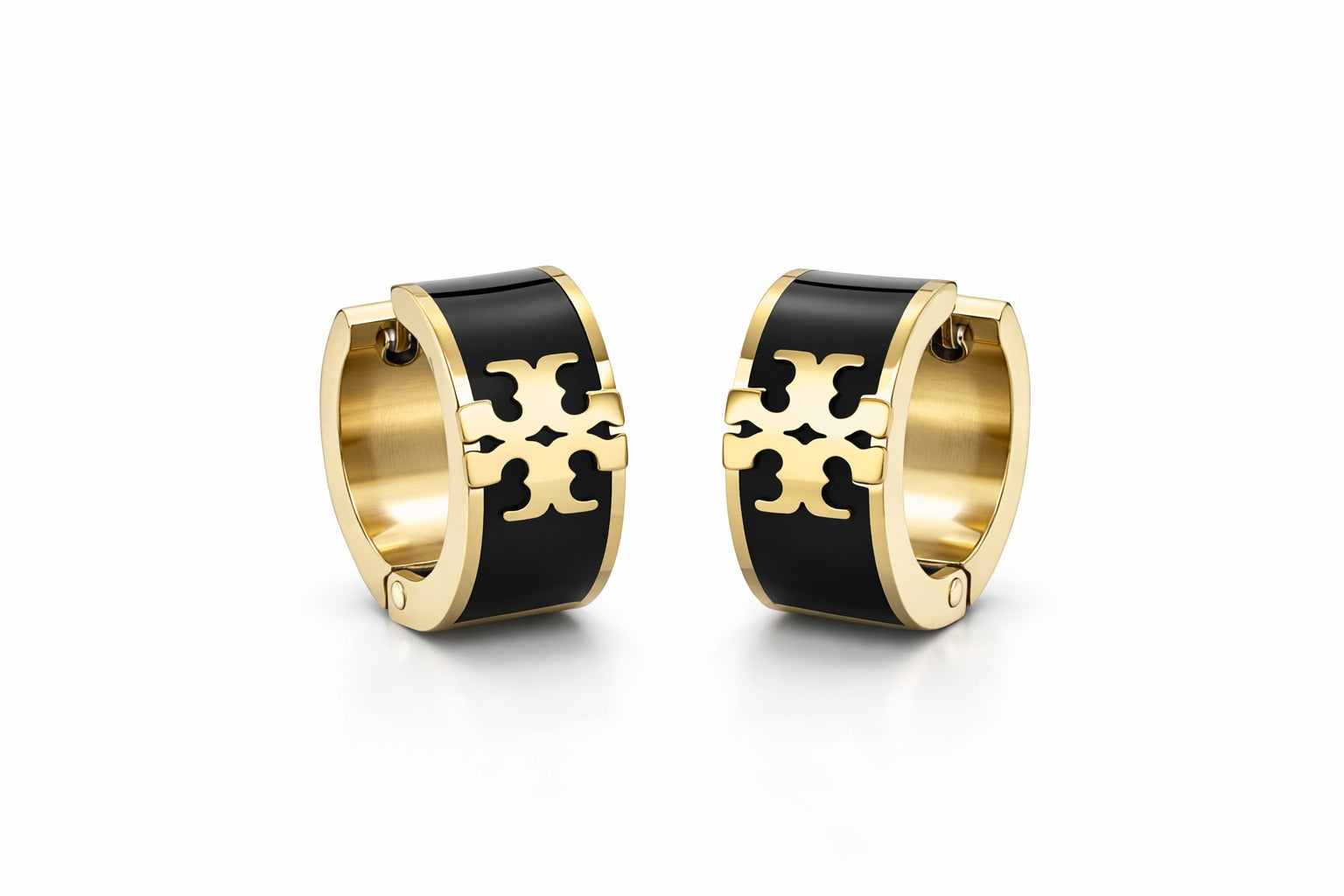 Bold geometry meets iconic style. These wide-profile hoops feature a premium black enamel band and a signature golden emblem. Sleek, polished, and perfectly sized to hug the earlobe, they are the ultimate "cool girl" staple for your collection.