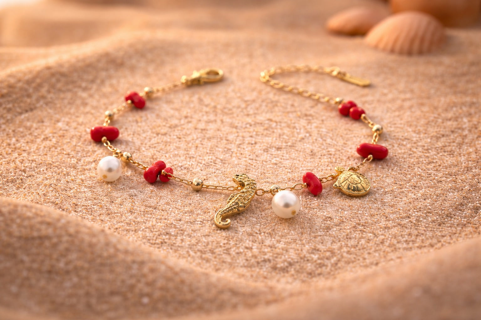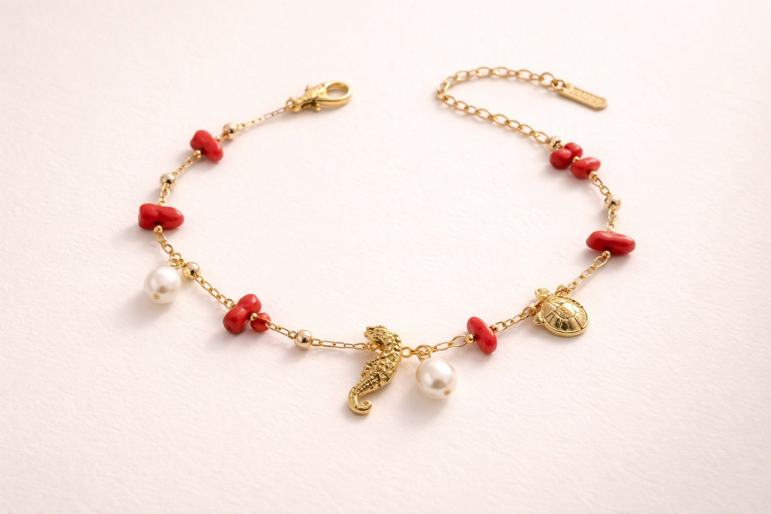 Capture the essence of the shoreline. Embrace the spirit of the sea with this intricately crafted charm bracelet. Featuring a delicate golden chain, this piece is adorned with vibrant crimson coral-style beads and lustrous white pearls that catch the light beautifully. The centerpiece features a finely detailed golden seahorse and a scallop shell charm, evoking memories of sun-drenched beaches and hidden ocean treasures.