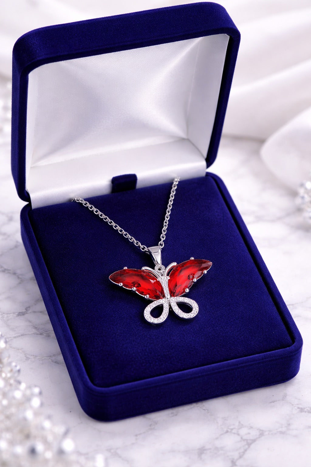 Make a passionate statement with the Crimson Monarch Pendant. This exquisite piece features a majestic butterfly design, defined by two large, vibrant ruby-red crystals that form the upper wings. The lower wings are intricately crafted with sparkling micro-pavé crystals set in polished silver-tone hardware, creating a brilliant contrast that captures the light with every movement. Elegant and bold, it’s a symbol of transformation and vibrant beauty.